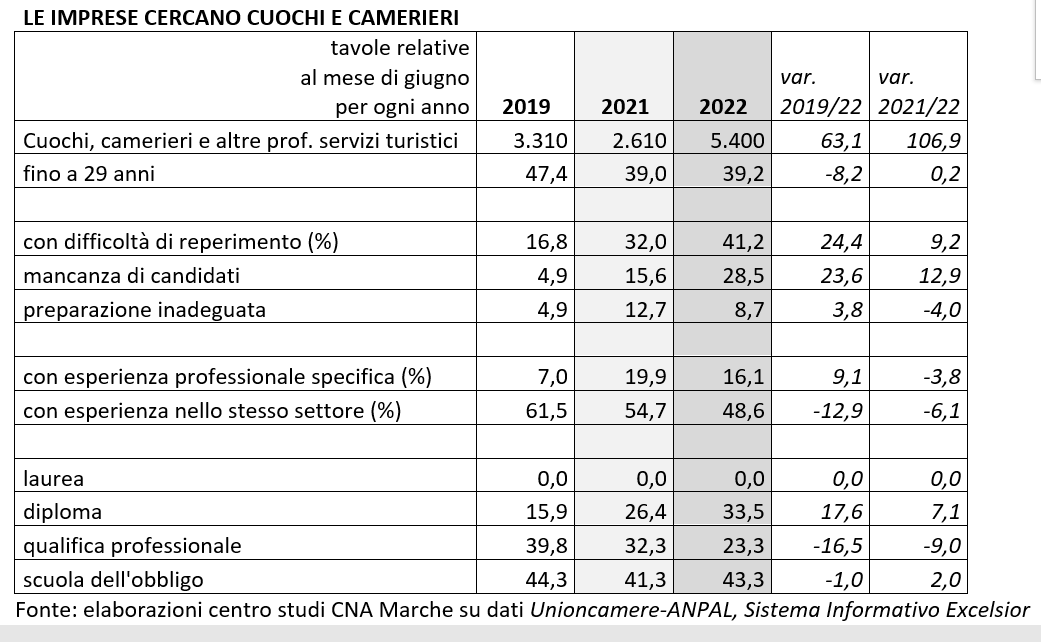 Secondo una indagine del Centro Studi Cna Marche, che ha elaborato i dati Excelsior – Unioncamere, a giugno 2022 le imprese hanno richiesto 5.400 tra cuochi e camerieri. Ma hanno potuto assumerne solo 3.175. Gli altri 2.225, pari al 41,2%, sono rimasti sulla carta ma non sono mai entrati in cucina. Nè in sala ristorante. Nel 28,5% perché sono mancati i candidati disponibili a farsi assumere e nell’8,7% per preparazione inadeguata.